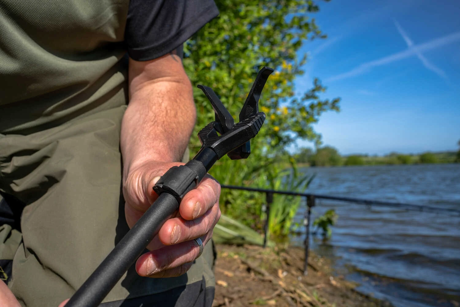 Deze speciale hengelsteun is counter gebalanceerd zodat de hengelsteun op steile oevers altijd in de juiste hoek staat. De steun kan vrij naar een verticale positie draaien, maar past zich aan de hengel aan wanneer deze in de achtersteun wordt geplaatst. Gebruik met banksticks voor het beste resultaat.