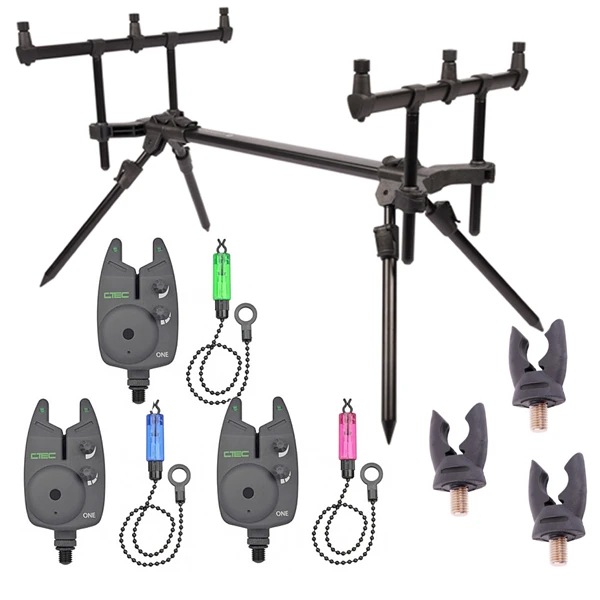 Een complete rod pod set, perfect voor het statisch vissen op karper of met doodaas op snoek! De set bevat, naast een zeer stabiele rodpod, beetmelders, hangers en achtersteunen, alles in drievoud!