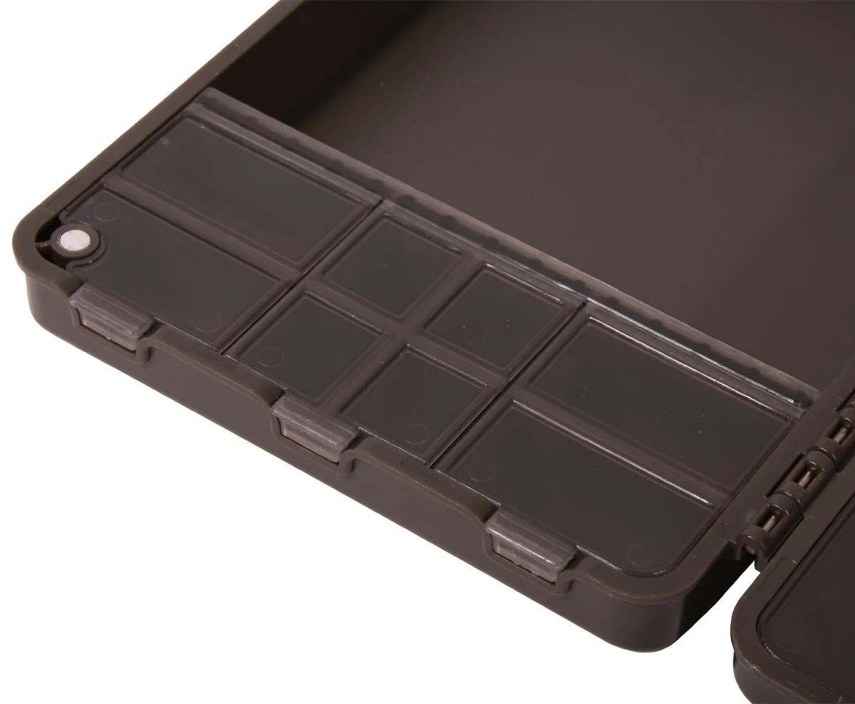 De Ultimate Magnetic Tacklebox is een superhandige box, voorzien van 12 verschillende compartimenten die veilig afgesloten kunnen worden. Een aantal compartimenten is weer onderverdeeld in kleinere vakken. Ideaal voor een veilige en geordende opslag van loodjes, haken, swivels, kralen, clips en al het andere kleine (reserve)materiaal dat je nodig kunt hebben tijdens een vissessie.